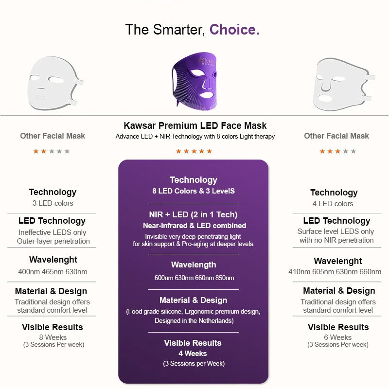 The Kawsar Premium LED Mask is an advanced at-home beauty device with 7-color LED light + Near-Infrared (NIR) technology. It helps visibly improve the skin: from fewer wrinkles and fine lines to a more radiant complexion, calmer skin, and reduction of acne or redness.